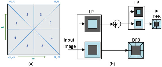 Let the input image feed to the LP filter (), where , which decomposes images into the low-pass signal and the detailed signal . The detailed image is passed through a DFB to get the directional images. In general, the detailed image at level j, , is further decomposed by DFB into -level directional images . Figure 4b shows an overall CT procedure.