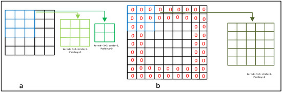 - Stride and Padding: The number of pixels a kernel will move in a step is determined by the stride size; conventionally, the size of the stride keeps to 1. Figure 6a shows an input data matrix of size , which is scanned with a kernel. The light-green image shows the output with stride size 1, and the green image represents the output with stride size 2. When we use a kernel, and stride size 1, then the convolved output is a matrix; however, when we use stride size 2, the convolved output is . Interestingly, if we use a kernel on the above input matrix with stride 1, the output will be a matrix. Thus, the size of the output image has changed with both the size of the stride and the size of the kernel. To overcome this issue, we can utilize extra rows and columns at the end of the matrices that contain 0 s. This adding of rows and columns that contain only zero values is known as zero padding.