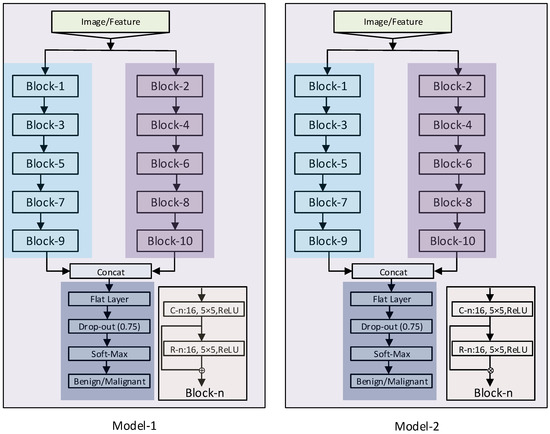- Model-1: Model-1 utilizes a residual block, represented as Block-n. Each Block-n contains two convolutional blocks named C-n and R-n. The C-n layer convolves the input data with a kernel along with a ReLU rectifier and produces 16 feature maps. The output of the C-n layer passes through the R-n convolutional layer, which also utilizes a kernel along with a ReLU rectifier. The R-n layer also produces 16 feature maps. The output of the R-n layer is merged with the output of the layer and produces a residual output. The output of Block-n can be represented aswhere represents the weight matrix and represents the bias vector.The input matrix passes through Block-1 and Block-2 as shown in Figure 8 (left image). The Output of Block-1 is fed to Block-3, the output of Block-3 is fed as an input of Block-5, the output of Block-5 is fed as an input of Block-7, and the output of Block-7 is fed as an input of Block-9. Similarly, the output of Block-2 is fed to Block-4, the output of Block-4 is fed as an input of Block-6, the output of Block-6 is fed as an input of Block-8, and the output of Block-8 is fed as an input of the Block-10. Now, the output of Block-9 and Block-10 are concatenated in the Concat layer. After the Concat layer, a Flat Layer, a Drop-Out Layer and a Softmax layer have been placed one after another. The output of the Softmax layer has been used to classify the images into Benign and Malignant classes.