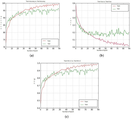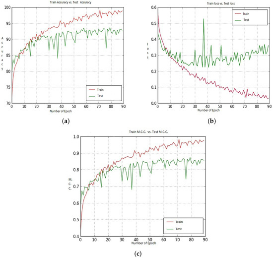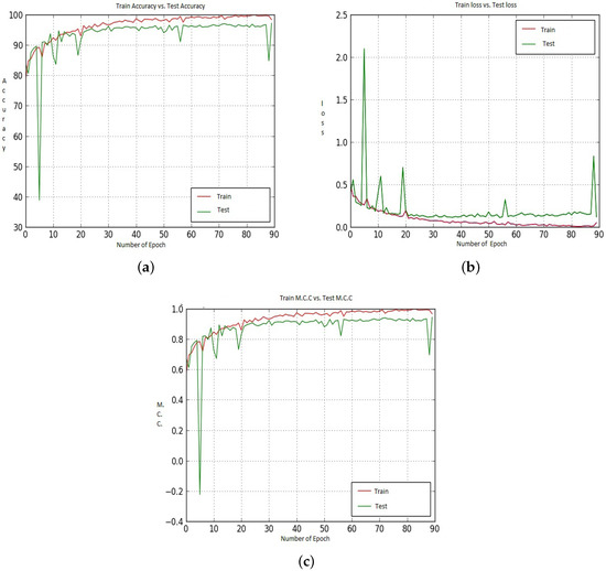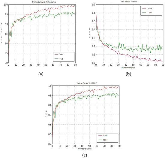 Figure 16 shows the Accuracy, Loss and M.C.C. values for different epochs when we utilized Model-1, CNN-CH and 400× dataset. Figure 16 shows that, up to around epoch 15, the Train and Test Accuracy, Loss and M.C.C. values remain almost the same with some exceptions. After around epoch 15, Train accuracy shows better performance than Test Accuracy. After epoch 50, the Train accuracy becomes constant at around 96.00%, whereas the Test Accuracy shows continually better performance. For the loss, as the epoch proceeds, the difference between the Train loss and the Test loss increased. For M.C.C., the Train M.C.C. value touches around 0.92.