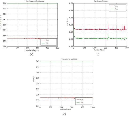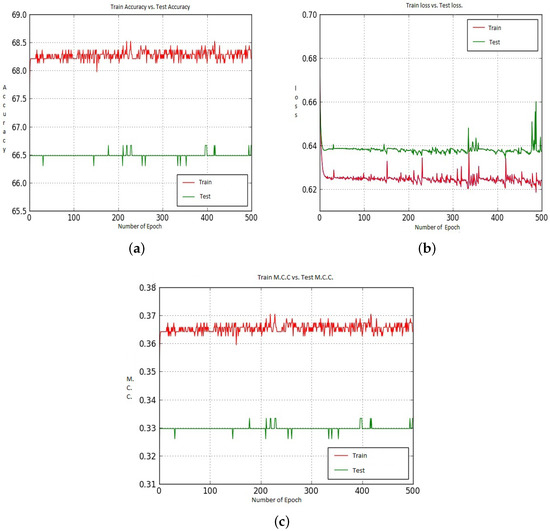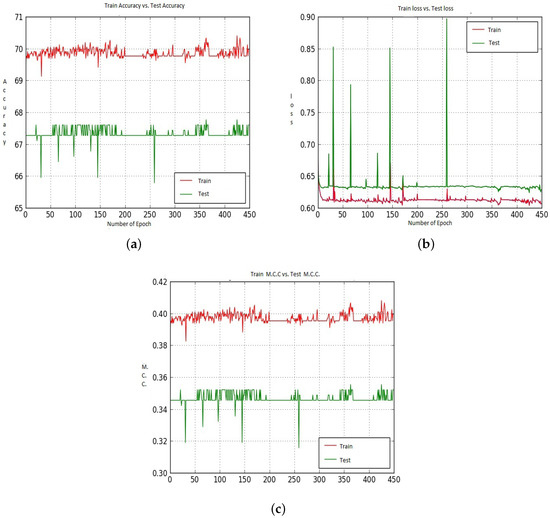 We saw earlier that using CNN-CH, CNN-CL and CNN-DC with Model-2 on the 200× dataset gave very poor performance. Figure 15 shows the Accuracy, Loss and M.C.C. values when we utilized the CNN-CH algorithm on the 200× dataset. For the Accuracy case, Train shows around 69.00% accuracy for all epochs up to 450. On the other hand, Test accuracy remains constant at around 67.5% throughout the epochs. For the loss performance, the difference between the Train and Test losses remains the same throughout all the epochs.