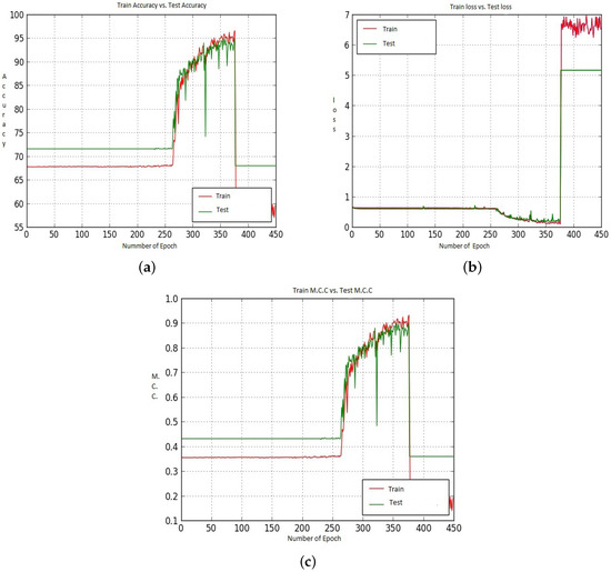 Figure 14 shows the Accuracy values for the CNN-CH case on the 200× dataset. Up to around epoch 15, Train Accuracy shows almost the same performance with some exceptions. After that, Train accuracy shows slightly better performance than Test accuracy. Train data shows 100% Accuracy around epoch 90, whereas Test Accuracy shows 97.00%. For the loss performance, as shown in Figure 14b, the Train loss is almost 0, whereas Test loss also shows quite small values but not 0. After around epoch 20, the Train and Test loss values remained constant. After that, the difference between the Train loss value and the Test Loss value is constant. As the epoch proceeds, the Train and Test M.C.C. values increased. Around epoch 85, the Train M.C.C. value touches the highest M.C.C. value, whereas the Test M.C.C. value is around 0.91.