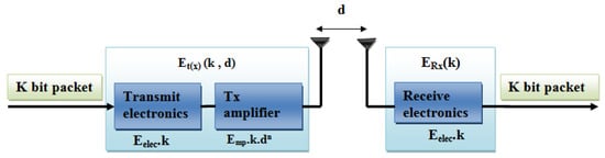 In this work, the WSN nodes send collaboratively their captured data to the sink. We employ the dissipation energy model [,] = as shown in Figure 1. In this figure, is the energy expended for the transmission of k bits along a distance , and is the energy expended to receive a k-bit of data. The element depends on modulation, filtering, digital coding, and the spreading of the signal []. This element is the energy dissipated per bit to work both the receiver and the transmitter circuits.