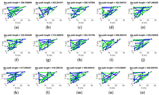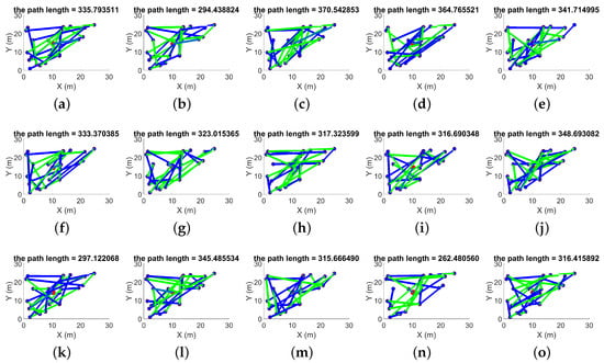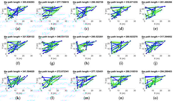 From iterations 1 to 15, Figure 3, we see that the minimum path is 253.2010 m and the maximum path is 369.8450 m.