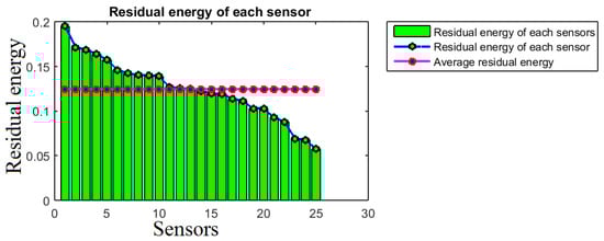 The residual energy of each sensor is almost the same as the average residual energy: 0.1242 j, the difference between the average value and the maximum and minimum values, respectively, are: 0.07079 j and 0.06663 j.