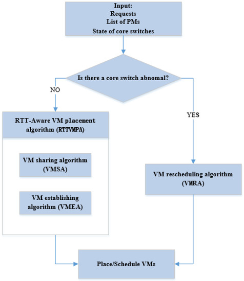 According to Figure 1, the users’ requests are connected to the load balancer that redirects these requests to candidate core switches according to the number of requests. The core switches are on the top tier of fat-tree topology in this architecture. When one of the core switches is out of work due to long-running or physical damage, the load balancer will redirect those requests to other working core switches. Moreover, the load balancer sends the detail information of these requests to the module: Dynamic Allocation of VM. The algorithms proposed in this paper run in this module, which can place the corresponding VMs in order to minimize the average RTT for these requests. An overview of our proposed algorithms is given in Figure 2. We will discuss these algorithms in detail in Section 4.