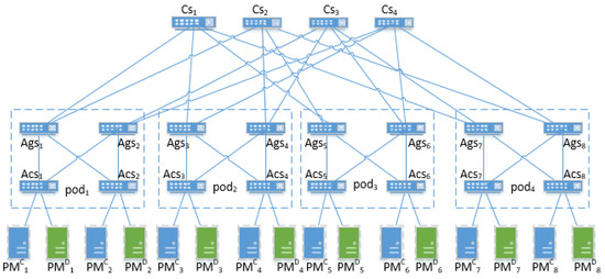 As shown in Figure 3, it is our adopted network architecture [26] of physical machines deployed in the cloud. The architecture makes use of fat-tree topology and is composed of three tiers. Core switches () are on top tier of the network architecture, that deliver corresponding users’ requests according to load balancer shown in Figure 1. Each point of delivery (pod) comprises with aggregation switches () and access switches (), they connect with all involving core switches. These two switches perform different network functions. The aggregation switches are capable of supporting many 10 GigE and GigE interconnects while providing a high-speed switching fabric with a high forwarding rate. They are required to provide redundancy and to maintain session state while providing valuable services to the access layer. In addition, the access switches can connect with PMs directly and provide a high GigE port density. The number of pods and three types of switches is related to the number of ports per switch. Besides, the number of ports per switch also determines the number of physical machines in pod. Suppose the number of ports per switch is , then there will be pods that contain aggregation switches and access switches in each pod. There are cores switches that connect to each pod with physical machines. Therefore, we can get switches that communicate with physical machines in total.