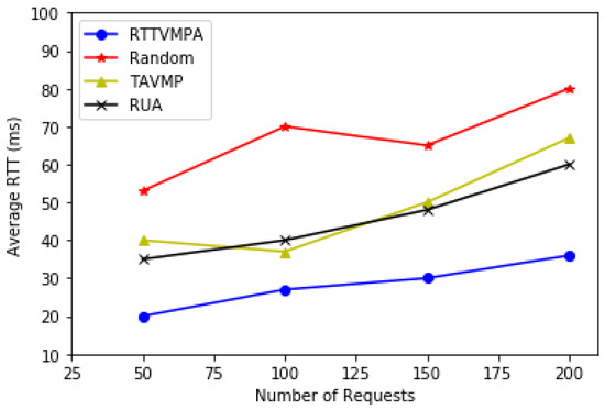 In the process of placing VMs, existing methods, such as random placement, traffic-aware VM placement algorithm and remaining utilization-aware algorithm, do not regard RTT as a condition for choosing PMs. In contrast, consider the RTT between the current request and the candidate PMs according to RTT matrix, our proposed algorithm sorts the candidate PMs in ascending order according to RTT for each core switch. The PMs with the smallest RTT could be selected first for those requests that are allocated to the same core switches, which can reduce the RTT for users’ requests. According to the result of Figure 4, we can see that our proposed RTTVMPA could get the lower average RTT compared with the other three algorithms. Moreover, RTTVMPA can keep a slow growth trend for average RTT when the number of requests increases and the other three algorithms obtain a higher average RTT.