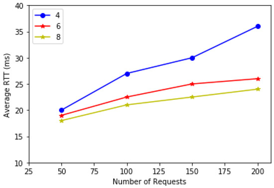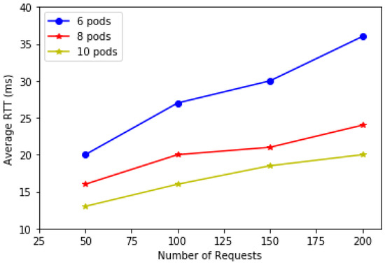 We investigate the influence of the number of pods in our adopted network topology on our proposed RTTVMPA. Varying the number of pods from 6 to 10, other settings are same to Table 1. As shown in Figure 6, we can notice that more pods could keep lower average RTT for the same number of requests.