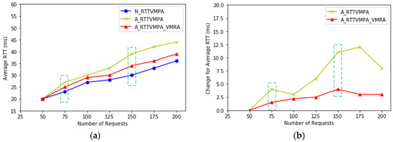 (a) shows the trend of average RTT for three different conditions; (b) shows the fluctuation of average RTT for A-RTTVMPA and A-RTTVMPA-VMRA compared with N-RTTVMPA.