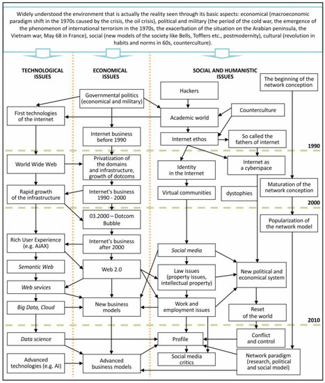 25] as an emanation of knowledge (and power, but this aspect was not examined). The discourse is thus a construction allowing a transition from the experimental level to the theoretical and epistemological level; the latter gathers different utterances into more general assembles. The experimental level is realized by different kinds of speeches about the Internet or in connection with it in the different utterances occurring in different kinds of science, media, business, politics, law, and in the cultural discourses, which are different and most difficult to document: ethical, moral, aesthetic, symbolic, etc. The mentioned assemblages are the collective thematic prejudices of different natures and sources, and most importantly, they are the result of a social practice, which means that every time they produce their own rules of validity, correctness, accuracy, or veracity. They are also the articulation of knowledge, which is local and rooted in social and cultural processes, and on the other hand, it reflects the actual, historical state that changes over time. The variability of the prejudices (and knowledge) is equivalent to the variability of the values of the dimensions in the physical interpretation. Per analogy, discourses can be considered as dimensions created in the space of discourses.