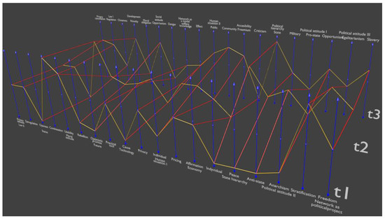 The reasoning of Byrne and Callaghan supports the approach showed in this text, although the obligation, which could be named as the epistemologist correctness, is weaker in the case of the humanist approach than that of social science, because of the greater distance of the first one from the experiential world of events. In the physical interpretation, the state space (configuration space, phase space, etc.) exists as an a priori and complete registration form of the states of the system, that becomes possible to describe (and to predict). Even more so, it becomes possible to construct some order of the sets of such trajectories that allows a higher level of description. The dimensions of this space are based on the parameters of a mathematical nature and are a priori assumptions. The equivalent of this space used here for the description of the Internet i.e., DS, appears as a result of the gradual uncovering and reconstruction of the most expressive or prevalent elements of the trajectory of the Internet in this space (that is, collecting and ordering the expressions of discourses dedicated to the Internet). Thus, the opposite is happening: discourses are revealed a posteriori, as they follow the development of the analysis of the phenomenon over time, but of course they also require preliminary findings of much greater generality such as political, cultural, or other aspects.