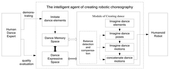 As can be seen in Figure 1, a humanoid robot shall master the basic dance elements firstly by imitating a human dance expert, and then by extending new dance elements by its imagination. The new dance elements are the basis of imagining new dance poses and motions further. A robotic dance consists of a sequence of dance motions, and a dance motion consists of a sequence of dance poses, each of which in turn consist of the dance elements generated by all the limbs of the whole body. Finally, the robot can concatenate the dance motions to create dance choreography autonomously, which is accomplished in “The Module of Creating dance”. The method of balance detection and compensation ensures that valid (balanced) dance poses, dance motions and dance choreographies are imagined effectively. It should be noted that the module of balance detection and compensation has been investigated before, and more details about it can be found in Reference [].