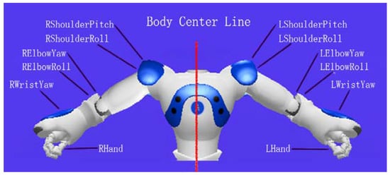In a mirror symmetrical limb, a joint (Ji,k) and its mirror symmetrical joint (Ji,k’) form a joint pair <Ji,k, Ji,k’>. By judging whether the two joints take the same values in a symmetrical body pose, the joint pair can be divided into two types: symmetrical joint pair, anti-symmetrical joint pair. In a symmetrical joint pair, two joints take the same values for showing a symmetrical effect, such as <LshoulderPitch, RshoulderPitch> (see in Figure 3), etc. In an anti-symmetrical joint pair, two joints take the different values (both have the same absolute values) for showing a symmetrical effect, such as <LshoulderRoll, RshoulderRoll> (see in Figure 3), etc.