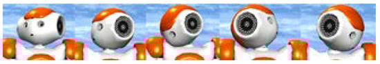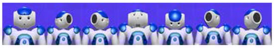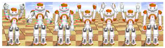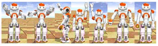 After imagining autonomously by the above method, the robot has imagined 1103 new dance elements on the Head limb, and 26,462 new dance elements on the Upperbody limb: 19,670 dance elements are imagined by Algorithm 1; 3782 dance elements are imagined by Algorithm 2 (symmetrical); and 3010 dance elements are imagined by Algorithm 2 (antisymmetrical). Figure 7, Figure 8, Figure 9 and Figure 10 show respectively some of them. So the robot has a total of 1103 (Head) × 26,462 (Upperbody) × 1 (Hand) × 7 (Lowerbody) = 204,313,102 possible new dance poses.