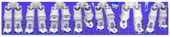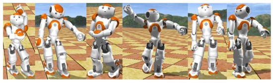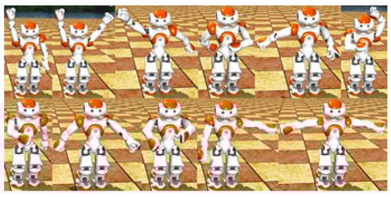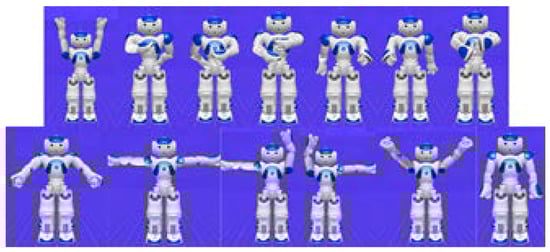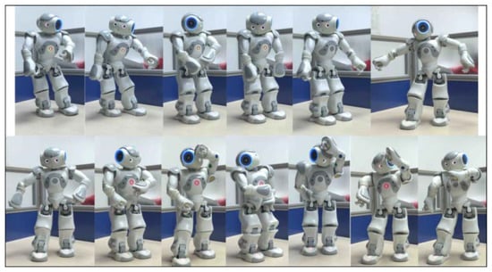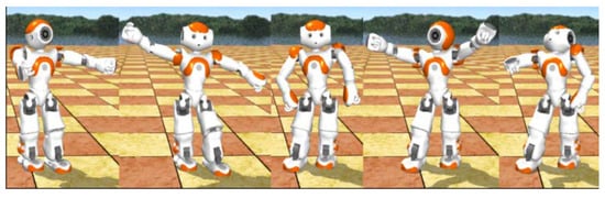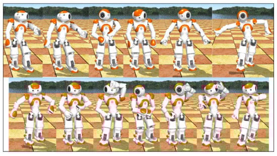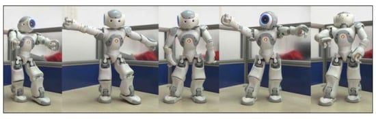 To imagine a valid (balanced) dance motion, the linear interpolation, balance detection, and balance compensation were used between any two adjacent dance poses in a dance motion. As shown in Figure 12, a new dance motion is illustrated. Similarly, the number of the concatenated dance motions (takes value from References [,]) in a robotic dance was determined randomly by the robot itself, and the concatenated dance motions were selected randomly too. In any two adjacent dance motions, the linear interpolation, balance detection, and balance compensation were used between the last dance pose of the previous dance motion and the first dance pose of the next dance motion. Finally, a robotic choreography was created autonomously, as shown in Figure 13.