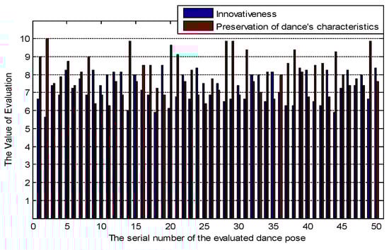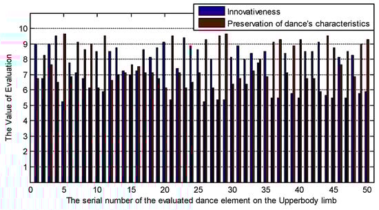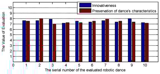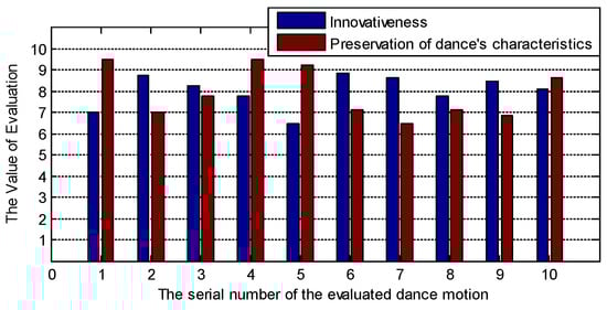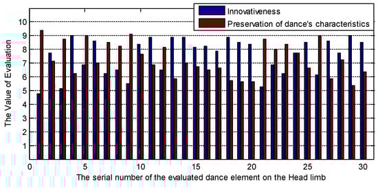 In the procedure of evaluation, we randomly chose 30 imagined dance elements on Head limb, 50 imagined dance elements on Upper-body limb, 50 imagined dance poses, 10 imagined dance motions, and 10 robotic dances respectively. Each evaluator was told to grade an object (a dance element, pose, motion, or robotic dance) on the innovativeness and preservation of dance’s characteristics respectively with a scale of 1 to 10. The value of 1 represents the worst and 10 represents the best. After the values of evaluation on the same object that come from all of the evaluators were acquired, a highest value and a lowest value were removed firstly (to avoid the adverse effects caused by the extreme data); and then the rest of the values took the average and so did all the objects. Furthermore, to understand these evaluation results, we introduced the quality scales of these dance objects: excellent (9.00–10 points), good (7.50–8.99 points), general (6.00–7.49 points) and bad (0–5.99 points) [].