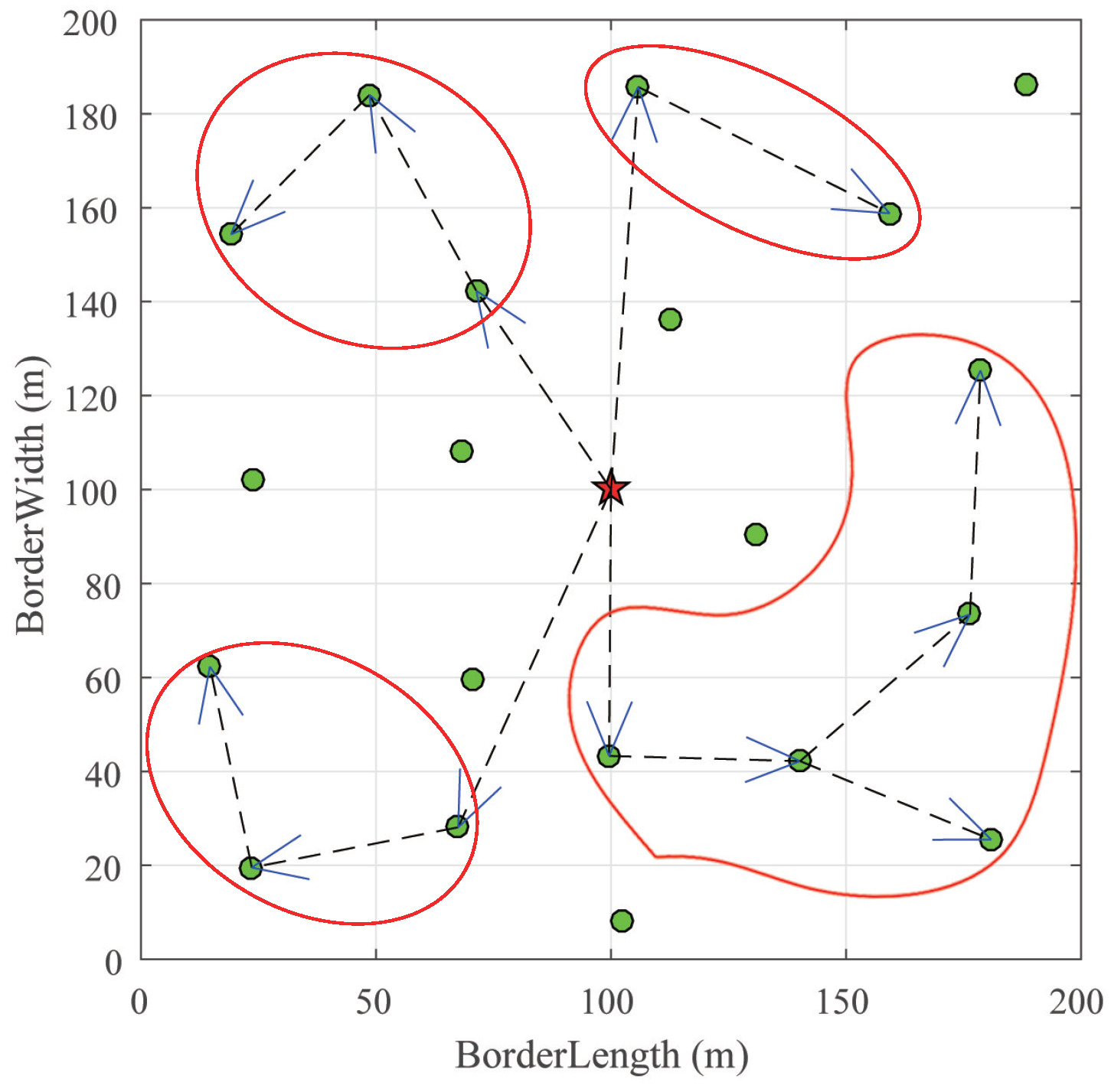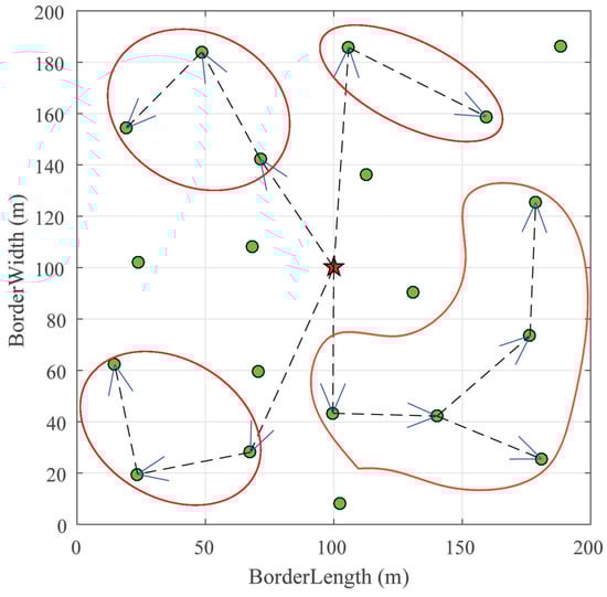Figure 2 shows a diagram form of data 1’s transmission under coalition game model using CO-CSA. It can be seen that the UAVs containing the requirement of data 1 finally form four coalitions, and the central control UAV transmits data through the multi-hop mechanism. From the diagram, there is no long-distance UAV-to-UAV link, which proves that the proposed model can effectively avoid high data transmission loss caused by long transmission path. This is consistent with the practical meaning of the system model.