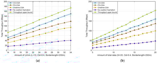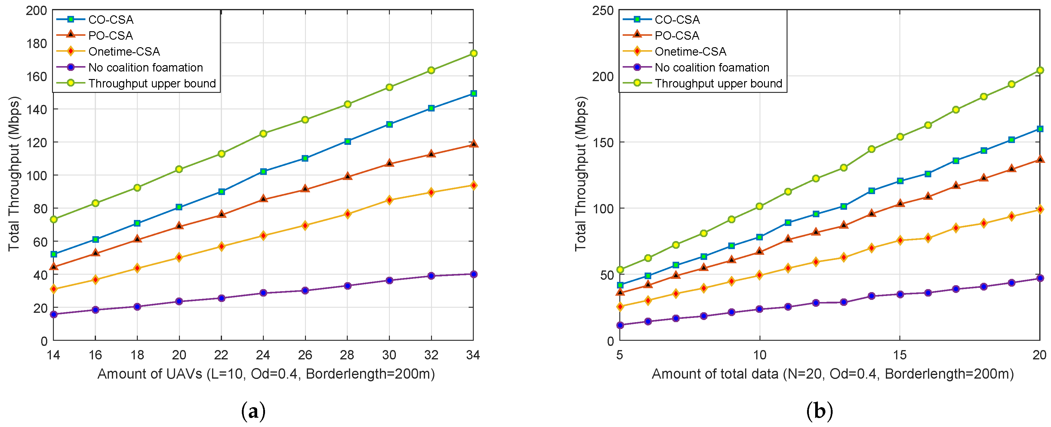 In Figure 4a, we can find that CO-CSA achieves at least 54.0% higher data throughput than Onetime-CSA considering amount of UAVs, while PO-CSA achieves at least 25.6% higher data throughput than Onetime-CSA. The main reason is that UAVs in coalitions have a greater probability and a stronger desire to leave the current coalition in search of better performance owing to the definition of coalition selection mechanism. In PO-CSA, however, UAVs are likely to be stuck with coalition members, because leaving the coalition could reduce profit for other members of the coalition. Moreover, in CO-CSA, since the potential function refers to the overall throughput of the system model, the algorithm with designed utility function can behave much better than PO-CSA. It is consistent with the description of Theorem 3. In addition, in Figure 4b, CO-CSA and PO-CSA can achieve at least 59.2% and 35.7% higher data throughput, respectively, than Onetime-CSA considering total data length. The analysis is the same as above.