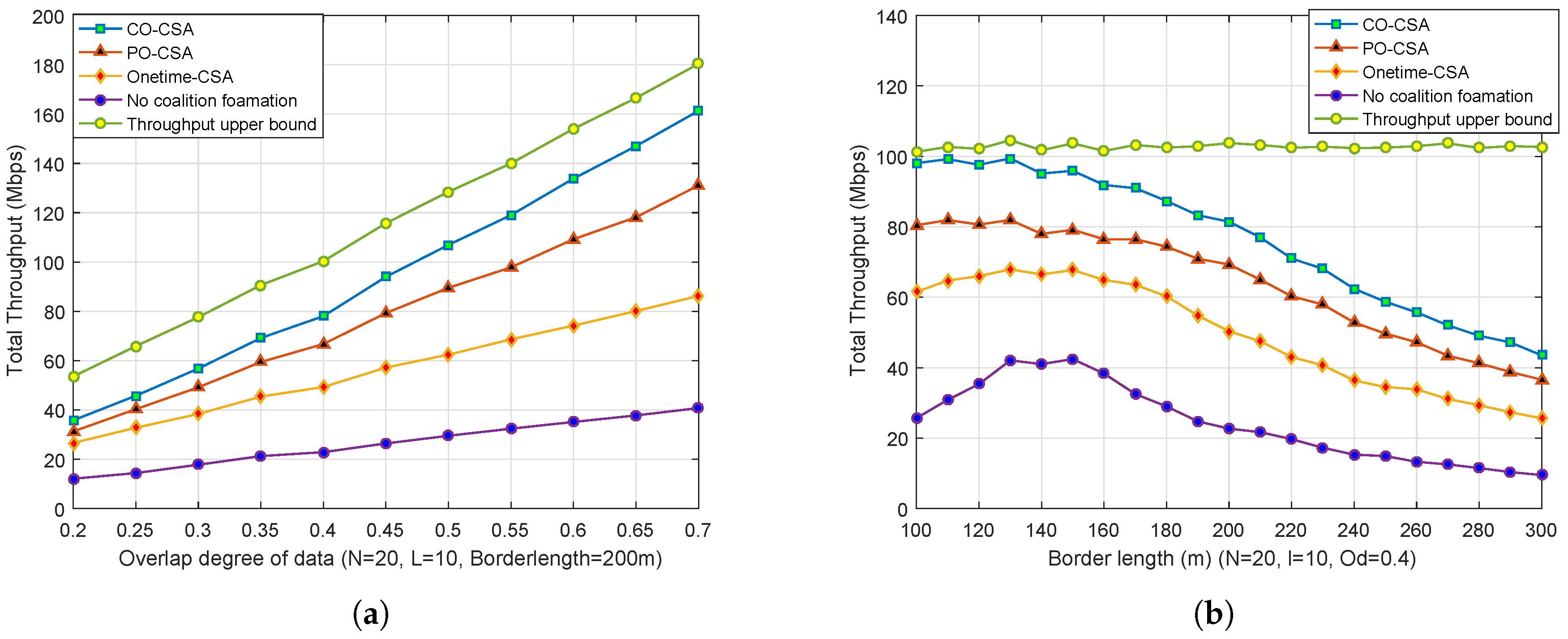 In fact, when other variables are fixed, number of UAVs and data length can directly affect overlap degree. Therefore, we executed a comparative analysis of algorithm performances considering overlap degree of data. It can be seen intuitively in Figure 5a that, as the overlap degree of data increases, CO-CSA can achieve at least 34.5% higher data throughput than Onetime-CSA, while PO-CSA can achieve at least 17.6% higher data throughput than Onetime-CSA. The performance of CO-CSA is also better than PO-CSA (analysis is the same as above). In summary, It shows the system model under coalition game framework can be well solved and the effectiveness of our proposed approaches is testified.