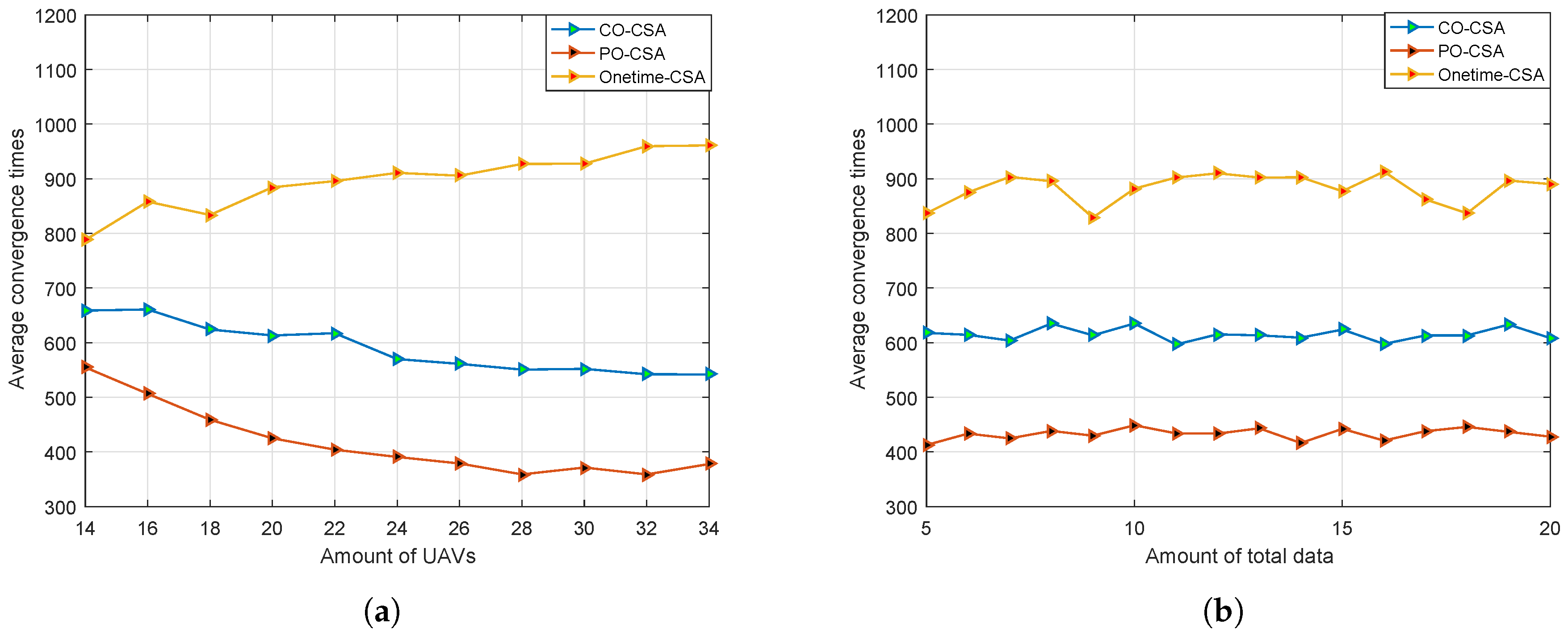 We analyzed the effects of CO-CSA and PO-CSA on the system model. Next, we compared the convergence performance of both algorithms. In each algorithm, we set one loop, which all UAVs traversed one time. When the UAV strategy in the three-round loop remains unchanged, the algorithm is considered to converge. Then, the average convergence times is defined to characterize the convergence performance.