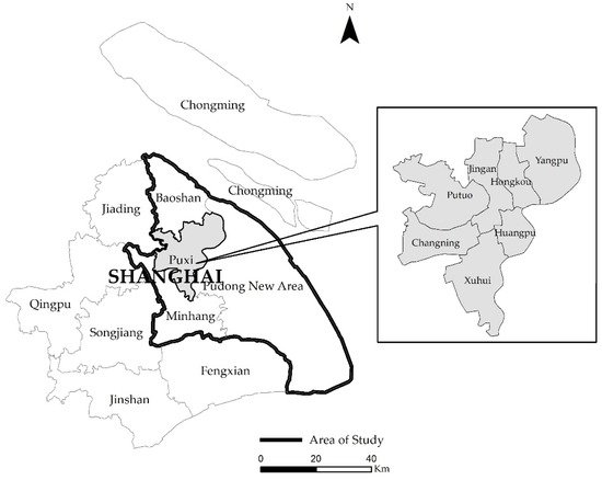 The Shanghai, China dataset used in the current study comes from Chinese microblog Weibo during April–May 2016. Shanghai, China (lying between 30°40′–31°53′N and 120°52′–122°12′E [80]) is located on the eastern edge of the Yangtze River Delta [81]. According to Gu, X., S. Tao, and B. Dai [82], in 2015, Shanghai had a total area of 8359 km2 with a population of around 24.15 million people. In 2016, Shanghai was divided into 16 county-level divisions: 15 districts (Baoshan, Changning, Fengxian, Hongkou, Huangpu, Jiading, Jingan, Jinshan, Minhang, Pudong New Area, Putuo, Qingpu, Songjiang, Xuhui, and Yangpu) and 1 county (Chongming) [83]. Seven of the districts (Changning, Hongkou, Huangpu, Jingan, Putuo, Xuhui, and Yangpu) are located in Puxi (literally Huangpu West). These seven districts are referred to as the city center [84,85] as shown in Figure 1. For the current study, ten districts of Shanghai (Baoshan, Changning, Hongkou, Huangpu, Jingan, Minhang, Pudong New Area, Putuo, Xuhui, and Yangpu) are analyzed, which are connected to the city center.