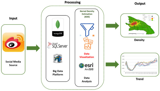Figure 2 presents the overall process flow for data collection and analysis. The location-based social media data analysis methodology is divided into two stages: data collection and storage, and analysis. The primary task of data collection and storage stage is to download a large number of Weibo data. During the data collection stage, the results came in separate files in JSON (JavaScript Object Notation) format by using a python-based [86] Weibo Application Programming Interface (API) [87]. JSON is considered one of the most widely used standard data formats and most major programming languages already have public reader and writer modules for it [88,89]. In order to be analyzed properly and stored in the database with the selected software, the dataset was transformed into one single file in CSV (Comma-Separated Values) format so all the check-ins could be listed regarding their publishing time. However, in the data analysis stage, the critical task was to extract and analyze the features (i.e., user ID, gender, date, time, and geo-location (longitude and latitude)) of data. The analysis phase used statistical analysis (probabilities of check-ins made), and data visualization by using ArcGIS (www.arcgis.com) to produce density maps and trends.