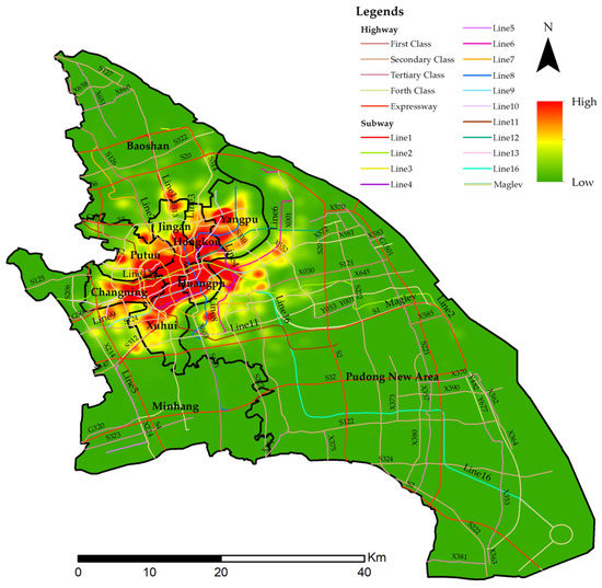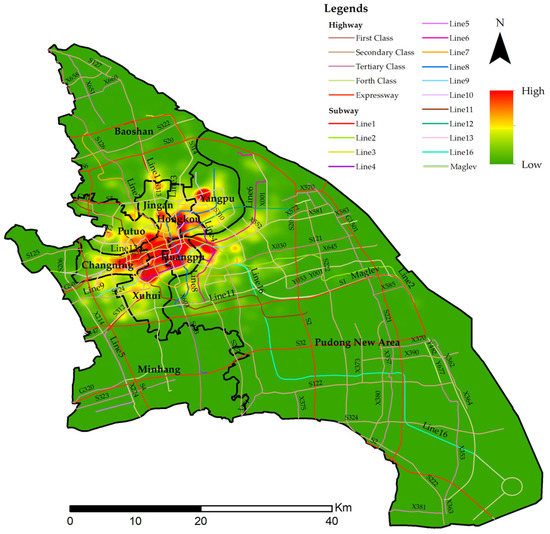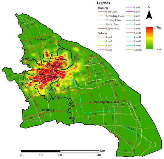 For the analysis, we used Weibo geo-location check-in data set, used KDE to analyze the spatial distribution of check-in data, and used ArcGIS for visualization. As shown in Figure 3, the areas shaded in red indicate a higher density of people, higher activity frequency, and higher concentration of social media use. It is no surprise that the city center has large clusters of activity and Figure 4 shows the overall check-in density in Shanghai over a period.
