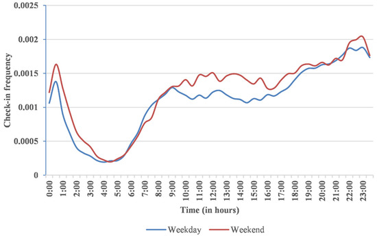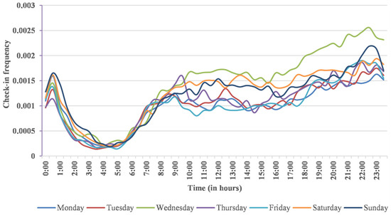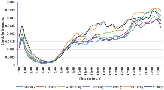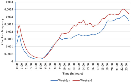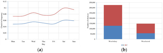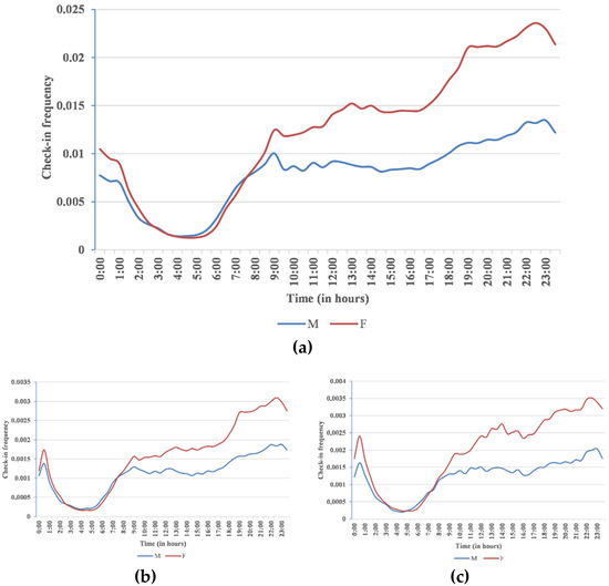 Figure 8 represents the daily check-in behavior of males and females. It can be observed from Figure 8a that frequency for a female was comparatively high relative to males. From Figure 8a,b, it can also be observed that the frequency of females was also high as compared to males during weekdays and the weekend. Moreover, high frequency of use was observed during the time interval 18:00–22:30 by males and females during weekdays and the weekend.