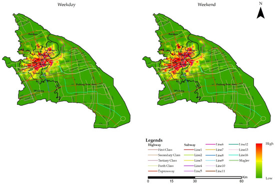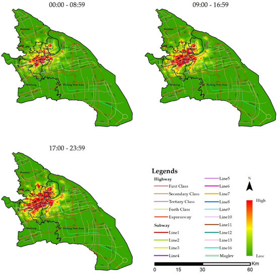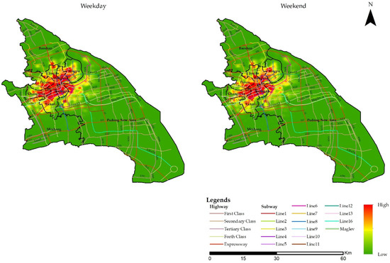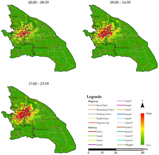 Let f(x) be the KDE function at location “x”, where “h” is the bandwidth. “D” is the distance from the point “i” to a specific location “s,” and “k” represents the Gaussian kernel function. In the KDE, bandwidth is considered an important parameter. If the bandwidth is too large, then the point density surface will become too smooth, while being too small will change point density distribution abruptly [99]. Therefore, the optimal bandwidth is determined by repeatedly setting the bandwidth and comparing the smoothness of the point density surface. In this analysis, we partitioned the output cells as 200 × 200 m areas. The cell was partitioned to provide a precise way to measure and compare urban intensity; this method is also applied in many spatial analysis studies [100]. Since the focus of this study is to observe the check-in behavior in Shanghai towards using Weibo and analyze the check-in behavior for males and females to observe the number of males, females, and total Weibo users in Shanghai, we also calculated the frequency of check-ins over the period (time slices) and during weekdays and the weekend.