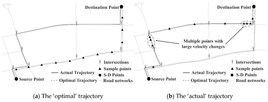 Therefore, to infer the anomalous trajectory, we introduce the ‘optimal’ trajectory as the normality of the trajectory. An ‘optimal’ trajectory is defined as a geometrically optimal driving of road networks from the source point to the destination point without knowing the driver’s driving experience or the road traffic conditions. As shown in Figure 1a, the black dotted line is an ‘optimal’ trajectory. For the ‘optimal’ trajectory, the velocity of each sampling point is the same, and the trajectory does not have frequent turns, detours, or route repetitions. In contrast to the ‘optimal’ trajectory, the driver will choose different road sections according to their driving experience or passenger requirements. Various special traffic situations can occur on the road networks, such as traffic congestion, traffic accidents, and traffic restrictions. This will lead to a difference between the ‘actual’ trajectory and the ‘optimal’ trajectory. As shown in Figure 1b, the black solid line is the ‘actual’ trajectory, the velocity of each sample point is different, and the distance between the sample points is different. When the difference is excessive, these trajectories are defined as anomalous trajectories.