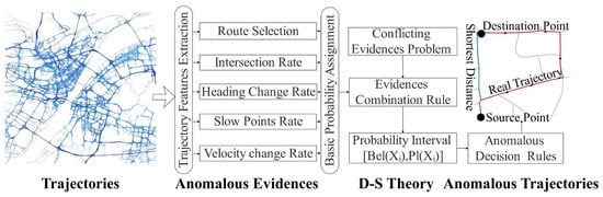 There are two aspects to be considered in applying evidence theory to anomalous inference [39,43]. One aspect is the selection of evidence. It is necessary to define appropriate trajectory features to reflect the anomalous situation of a trajectory and then fuse these trajectory features as evidence. The other aspect is how to solve the conflicting evidence problem, which occurs when collecting mass evidence from different information sources. When the evidence is completely the opposite or has a value of 0, the combination of varying evidence with the D-S theory will cause the result to be not calculable or 0. Ge et al. [25,28] developed a taxi-driving fraud detection system and found two types of evidence: travel route evidence and driving distance evidence. The study combined the two types based on the D-S evidence theory. Finally, it created the taxi-driving fraud detection system with a large-scale real-world dataset of taxi GNSS logs. However, this study divided the trajectory into grids, without considering the time and speed-related features of the trajectories. Zhou et al. [26] presented an approach using behavior constraints based on evidence theory. They calculated three features: the ratio of travel length between GNSS traces and the shortest distance path; the cost index of road selection based on the driver’s experience; and travel start times. They then combined these three features in an evidence-theory framework to determine the anomalous degree of each trajectory. However, this study combined only two trajectory features, without considering velocity-related features or the conflicting evidence problem.