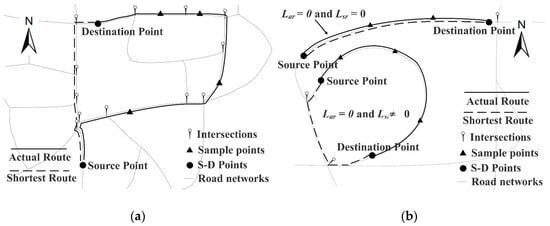 Due to considerations such as distance and cost, the driver has multiple choices of trajectory routes based on the same source and destination. Considering that the driver’s income is related to distance, the shortest route could be the driver’s optimal choice. The route selection feature () is used to qualitatively determine the difference between the actual route () and the shortest route (), as shown in Figure 3a. is the actual length of the trajectory, and is the length of shortest distance route from the same source point to the destination point. In urban areas, the shortest route is computed with reference to so-called generalized costs [29]. In our work, we consider the length of the trajectory as the cost and obtain the shortest distance route. The method uses the Dijkstra algorithm [44].