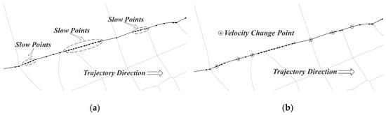 Because the trajectory consists of a series of sample points, the instantaneous velocity of the sample point cannot reflect the actual movement of the trajectory. Therefore, we use the average velocity of the trajectory segment as the velocity of the current sample point (). The threshold of slow points is . The slow point rate is defined as follows: