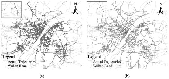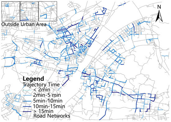 The geographic distributions of anomalous trajectories are represented in Figure 12. Here, changes in the blue color depth indicate the times of the trajectories: light-colored trajectories are relatively short, and dark-colored trajectories are relatively long. The lengths of these trajectories are tagged on the map. Some trajectories are located outside the urban area of Wuhan and are displayed in the small box in the upper-left corner of Figure 12.