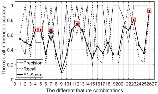Overall, inference accuracy changes across the different combinations of trajectory features, as shown in Figure 9. When is high, is correspondingly lower, that is, the changes in and generally tend to be mostly opposite. As shown by the red box in Figure 9 when only two features are combined, the maximum value of is 0.667. When three features are combined, the maximum value of is 0.75. When four features are combined, the maximum value of is 0.8. When five features are combined, the maximum value of is 0.923. As the participation features increase, the accuracy of the result increases. Therefore, the judgment of our anomalous trajectories requires the combination of five trajectory features.