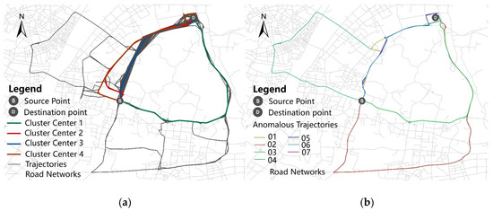 In the first example, the source and destination points are on the same road and are not far from each other, which is manifested in the large and features (shown in Figure 13a). Due to the closeness of the source and destination points, such trajectories are primarily likely to be requested by passengers to go to a certain place and return to the source point. However, it should be noted that all loop routes are considered as anomalous trajectories; their difference lies in the and features. These two features are large, indicating that special events occur on the road. Therefore, in Figure 13a, the left trajectory is inferred to be an anomalous trajectory, and the right trajectory is considered as normal.
