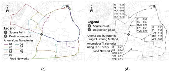 We used 272 trajectories that selected the same source and destination points in our experimental trajectories. The geographic distribution of these trajectories is shown in Figure 10a. We inferred 7 anomalous trajectories according to the proposed D-S evidence theory. In addition, many of the trajectories were similar; as shown in Figure 10a, there were four cluster centers and four normal trajectory clusters could be acquired. To compare with the results of our method, we also detected 9 anomalous trajectories according to the trajectory clustering method proposed by Wang et al. [12]. The two anomalous trajectories are the color lines in Figure 10b,c, respectively. The trajectory clustering method considers the similarity between trajectories and clusters trajectories with large similarities; those trajectories that deviate from these clusters are defined as anomalous trajectories. As shown in Figure 10d, the results of the two methods show that there are 6 identical anomalous trajectories and that there are 1 and 3 different anomalous trajectories. The dashed lines are the different trajectories obtained by the trajectory clustering, and the solid line is the different trajectory obtained using our method.