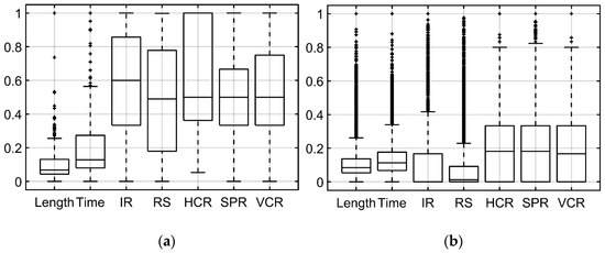 Box plot concerning trajectory distance, time, and five features. (a) The anomalous trajectories. (b) The normal trajectories.