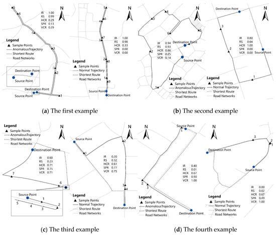 There are four examples to explain our results and show the plausibility of values. Each example includes a pair of anomalous trajectories and normal trajectories that are similar in some trajectory features, as shown in Figure 13, in which the black solid line is the anomalous trajectory or a normal trajectory. The black dotted line is the shortest route. The five features of the trajectory are also shown in the figure. To clearly show the movement of the trajectory, we moved the overlapping trajectories to each side of the road.