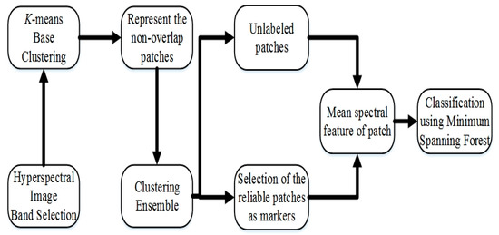 In this section, the band selection algorithm and the algorithm for the generation of basic clustering are discussed in Section 3.1; the construction and re-labeling process for patches are proposed in Section 3.2; and the classification process is discussed in Section 3.3. Finally, the comparison methods are explained in Section 3.4.