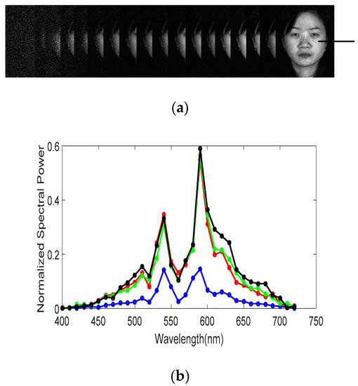 The PolyU–HSFD, gathered by Di et al. [15] and acquired with the CRI’s VariSpec Liquid Crystal Tunable Filter (LCTF) and a Halogen Light system, consists of 25 data subjects of Asian descent (8 females and 17 males; 21–38 years old), with varying poses (frontal, right and left view of a subject) and time periods that include the hairstyle changes and skin condition diversification. Each data cube (see Figure 7 for one example) size is 220 × 180 × 33 pixels, with 33 bands covering the spectral range of 400–720 nm with a step size of 10 nm.