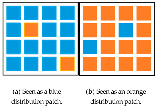 Hence, all of the basic clustering can be represented as patches , that is, the size of original basic clustering is 220 × 180; after being redefined with a size arrangement of 4 × 4 pixels and it becomes to 55 × 45 patches. Integrated with the selected basic clustering, patches with the samevalue remain as optional patches. According to the degree of the homogeneity rule, the optional patches with the highest homogeneity will be considered as the reliable patches called markers. Then the markers can be classified. In Figure 3, for example, as = [14, 2] and = [2, 14], we set to the blue cluster ( = 1) and set to the orange cluster ( = 2), which satisfy the rules 13 < a < 16 and 13 < b < 16. Specific situation rules depend on the size of the patch. Other unmarked patches need to be further classified. This method achieves reduced computational complexity and a faster execution speed.
