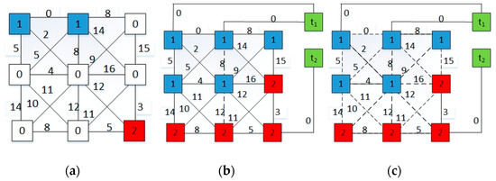 Actually, the above rules of finding the minimal sum of edge weights for graph can be resolved by a region-growing method. This means starting from a certain vertex as seed (marker) and gradually adding neighboring vertices (patches) according to the minimum weight certain criteria between two vertices of a graph. Prim’s algorithm can be used to achieve the MSF algorithm. An unlabeled patch should be added to the seed every time, until all of the patches of the graph are classified. A prerequisite to be aware is that the graph should contain markers with different categories, as Figure 4a illustrates. Two classes of extra vertices ( = 1, 2) are added to the graph linking the corresponding markers to form two categories of MST, as illustrated in Figure 4b. Each extra vertex is connected by the edge with a null weight to the markers. As illustrated in Figure 4c, markers are viewed as seeds; and unlabeled patches are added to the tree to meet the criterion of minimum sum of the edge weights. While lacking markers are a common situation in a graph, we have to select markers manually. In this case, we select a marker within a graph that has the highest SID similarity to the nearest markers of this graph.