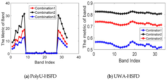 Figure 6a illustrates the band selection result of the Hong Kong Polytechnic University Hyper-Spectral Face Database (PolyU-HSFD), in which the facial images of the 1, 2, 3, 4, 5, 6, 7, 28, 29, 30, 31, 32 and 33 bands have lower SNR in three different weight combinations. The Figure 6b from the University of Western Australia Hyper-Spectral Face Database (UWA–HSFD) indicates that the features on 25, 26, 27, 28, 29, 30, 31, 32 and 33 bands have the least effective information in three different weight combinations. This phenomenon is caused by the camera system. The sorting of the other bands indicates similarity in the first two weight combinations, so we site a greater weight for contrast to select the discriminative bands.