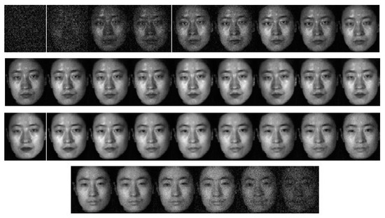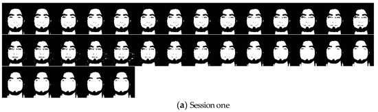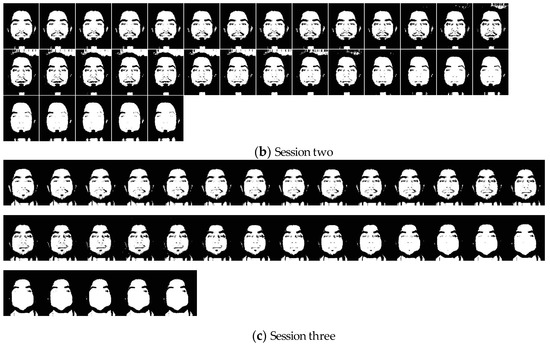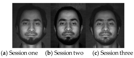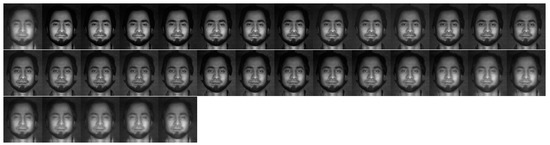 UWA-HSFD is acquired with the CRI’s VariSpec Liquid Crystal Tuneable Filter (LCTF) and integrated with a photon focus camera. UWA-HSFD consists of 79 data subjects in the frontal view taken over 1–4 sessions (see Figure 12 for one example) [32,33]. Each data cube of a hyper-spectral facial image contains 33 bands covering the visible spectral range from 400 to 720 nm with a 10 nm step. The SNR in this database is relatively lower because Uzair et al. [31] used a novel algorithm that automatically adjusted the camera exposure time based on the filter’s transmittance, illumination intensity and CCD sensitivity for each frequency band. Most subjects had slight head movements and eye blinking during image collection process, therefore, there was alignment errors between individual bands.