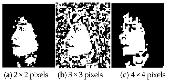 In this database, we select three non-skin closed local features for assessment, for example, brows, eyes and a mouse. We can see that the 2 × 2 patch size achieves better performance, by improving the F1-score by 0.67%, −0.02% and 0.29% for local features. In general, the non-skin area features are more prominent in a 2 × 2 patch size, because the contour boundary is more obvious. Therefore, we choose the patch size of 2 × 2 pixels for the proposed algorithm in all the following experiments.