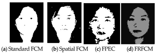To evaluate the performance of the proposed algorithm, two algorithms are selected for comparison, including the standard fuzzy c-means (FCM) [25,26,27] and spatial FCM. Different from hard clustering k-means, FCM calculates the membership for each pixel to all clusters center. FCM is derived by iteratively minimizing a cost optimization function, that is, the weighted error of the sum of squares minimization inter-class. The function is defined as follows: