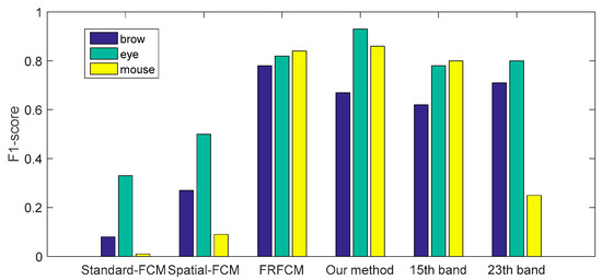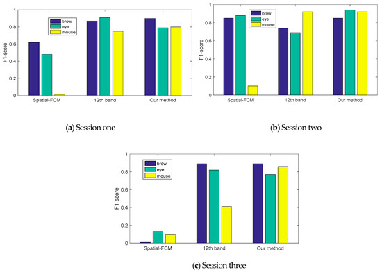 The performance for the proposed algorithm in Figure 15a,c,e is compared with spatial FCM in Figure 15b,d,f and the basic clustering, respectively. We can observe that the local features nose and mouth are not recognized for session one, as illustrated in Figure 15b and the recognition is not complete and clear for session two, as shown in Figure 15d. The most unsatisfactory result has little useful information for session three, as illustrated in Figure 15f. Relatively speaking, local features are clear and complete in the clustering ensemble. Table 3, Table 4 and Table 5 and Figure 16. illustrate the performance evaluations of three local features (brows, eye and beard) for three sessions. Compared with the better basic clustering of the 12th band, the F1-score rate improved by 0.03%, −0.12% and 0.05% for local features in session one; 0.11%, 0.25% and 0% for local features in session two; and 0%, −0.05% and 0.45% for local features in session three. Compared with the spatial FCM, the F1-score rate improved by 0.28%, 0.31% and 0.80% for local features in session one; 0%, 0.06% and 0.82% for local features in session two; and 0.89%, 0.64% and 0.86% for local features in session 3. Totally, the proposed algorithm is superior to other two algorithms.