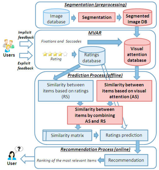 An overview of the proposal herein, denominated CFAS (Collaborative Filtering recommender system with Attentive Similarity), is shown in Figure 1. More specifically, CFAS is divided into four main components, the Segmentation Process, the Management of Visual Attention and Ratings (MVAR), the Prediction Process, and the Recommendation Process.